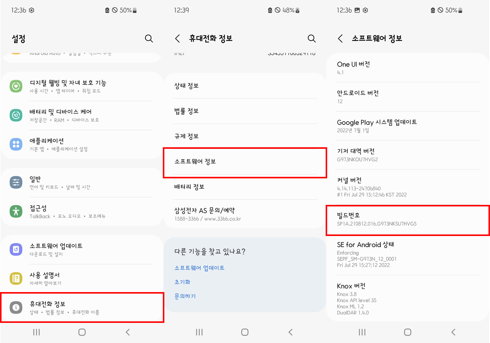 설정 > 휴대전화 정보 > 소프트웨어 정보 > 빌드번호를 7번 연속 클릭 해준다.