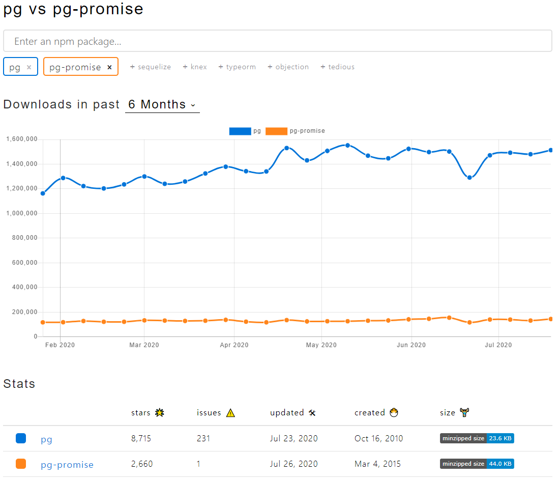 아래는 pg vs pg-promise 다운로드 수를 보여준다.