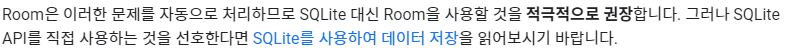 또한 데이터가 변경되었을 시 LiveData, Flow 등을 이용해서 실시간으로 UI에 적용할 수도 있고 데이터 캐싱도 자동 지원해준다. 이런 장점들이 많아서 Room을 사용하는 것을 안드로이드 공식문서에서는 적극 권장하고 있다!
